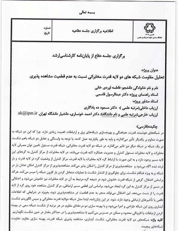 )فاطمه اوردی خانی) تحلیل مقاومت شبکه های دولایه قدرت مخابراتی نسبت به عدم قطعیت مشاهده پذیری