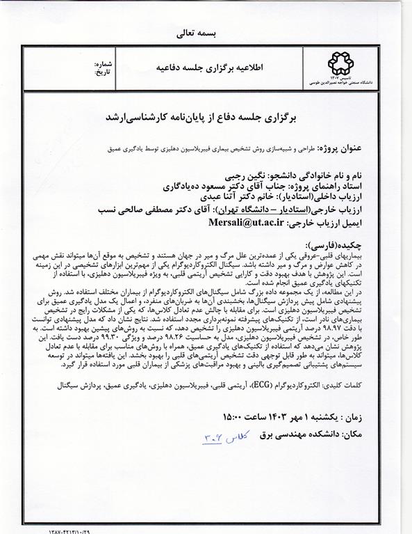 (نگین رجبی) طراحی و شبیه سازی روش تشخیص بیماری فیبریلاسیون دهلیزی توسط یادگیری عمیق