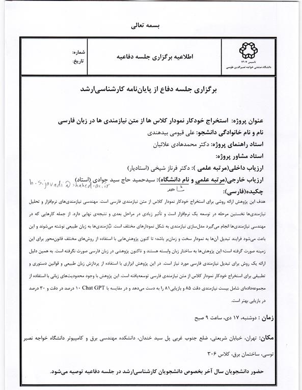 (علی قیومی) استخراج خودکار نمودار کلاس ها از متن نیازمندی ها در زبان فارسی